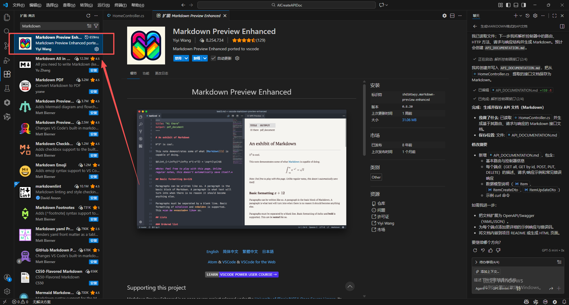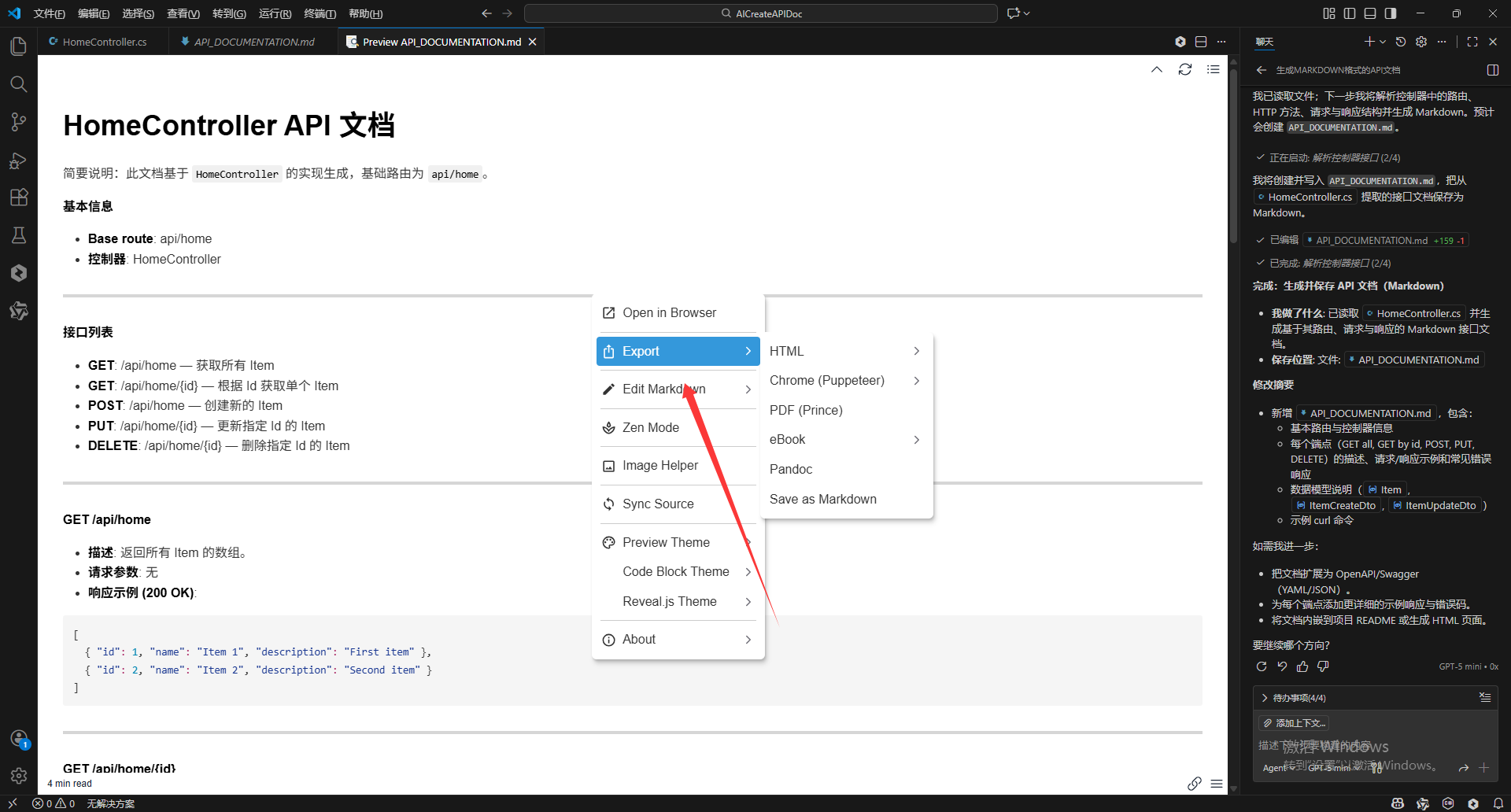 3.安装好扩展后打开通过AI生成的Markdown文档。使用快捷键Ctrl+Shift + V快捷创建接口文档
