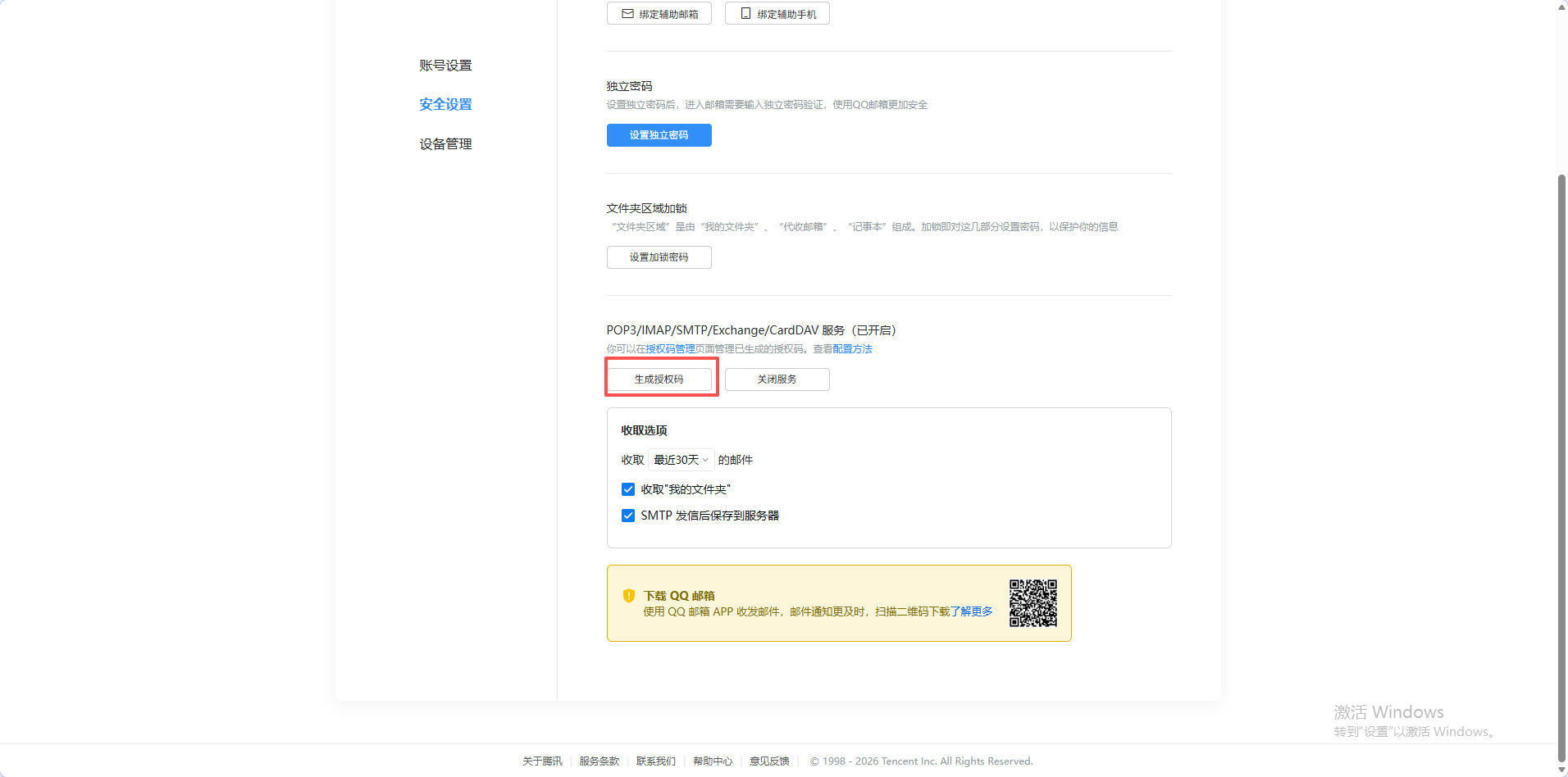 6.身份验证密码这边,需要再网页上面搜索qq邮箱然后找到设置找到账户与安全进入之后点击安全设置,里面会存在一个生产授权码,生成之后复制到身份验证密码这边就好了