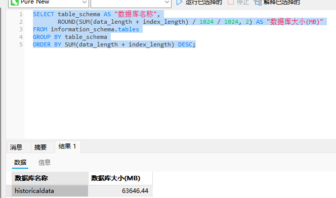 SELECT table_schema AS "数据库名称", ROUND(SUM(data_length + index_length) / 1024 / 1024, 2) AS "数据库大小(MB)" FROM information_schema.tables GROUP BY table_schema ORDER BY SUM(data_length + index_length) DESC;