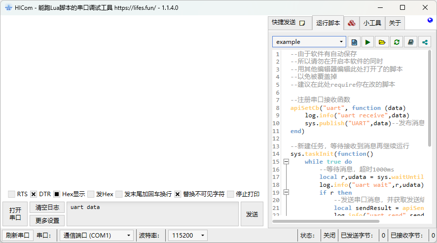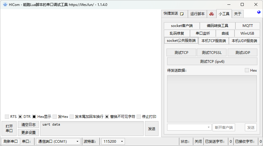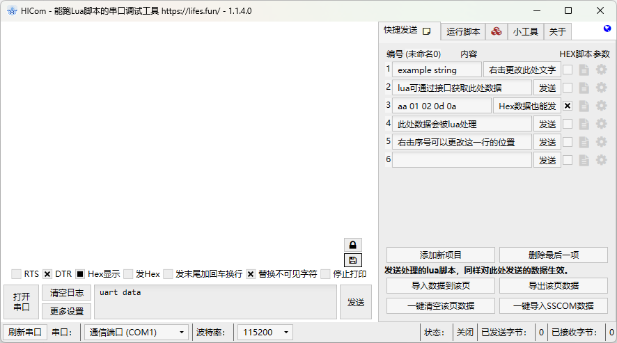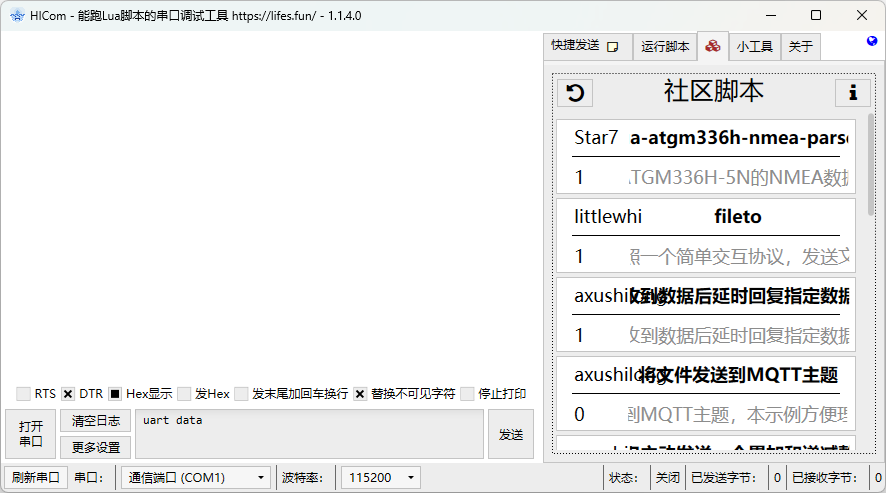 HICom 是一款面向串口调试场景的 Windows 工具,核心特点是:除了常规串口收发功能外,还内置了 Lua 脚本运行环境。这意味着它不仅能“看数据、发数据”,还能做自动应答、协议解析、定时任务、曲线绘制、网络联调等更高级的工作。