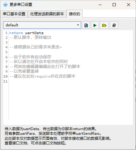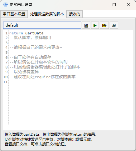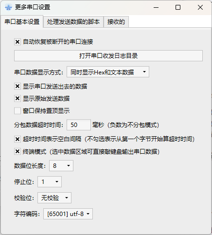 更多设置:打开高级串口设置、发送/接收脚本设置窗口。